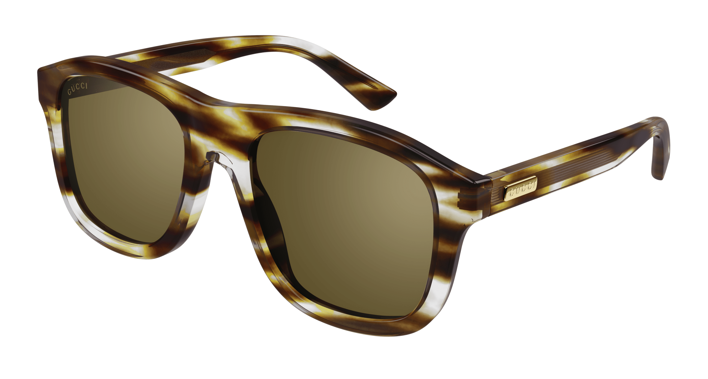 Pilot shape. Gucci lettering logo on temples. Summerish colour palette with a balance between transparent & solid colour. Concept inspired by the youthful and alternative atmosphere of Carnaby Street, London, in the 60's.