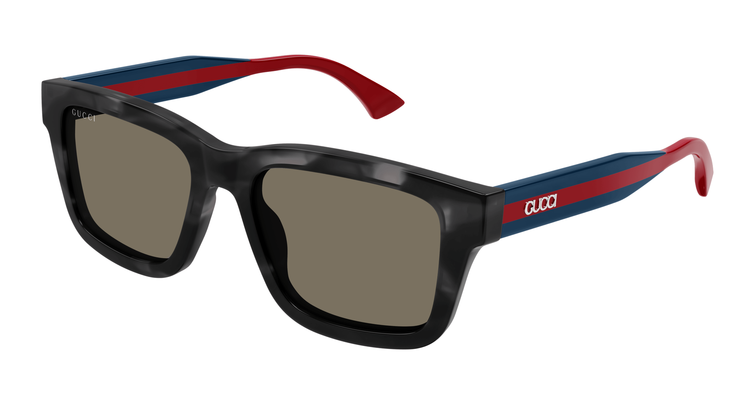 Commercial shape with the web detail on a medium temple. Wayfarer shape. Gucci new lettering logo on web temple in gold and silver. Commercial yet cool color palette featuring institutional Green-Red-Green and Blue-Red-Blue web temples.