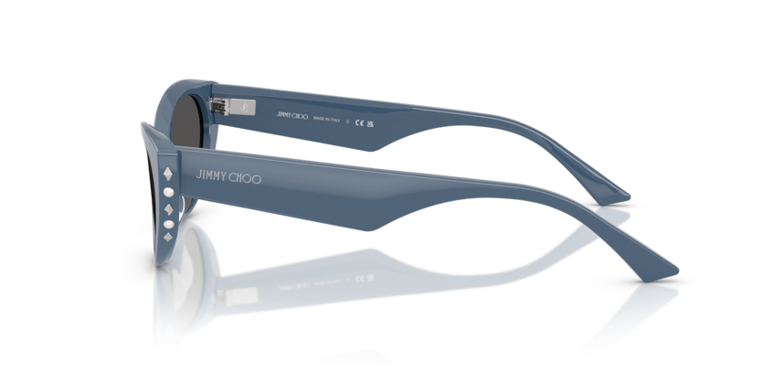 A hot print Jimmy Choo logo in silver or pale gold graces bold acetate temples, while the customized hinge features a laser-engraved JC emblem.